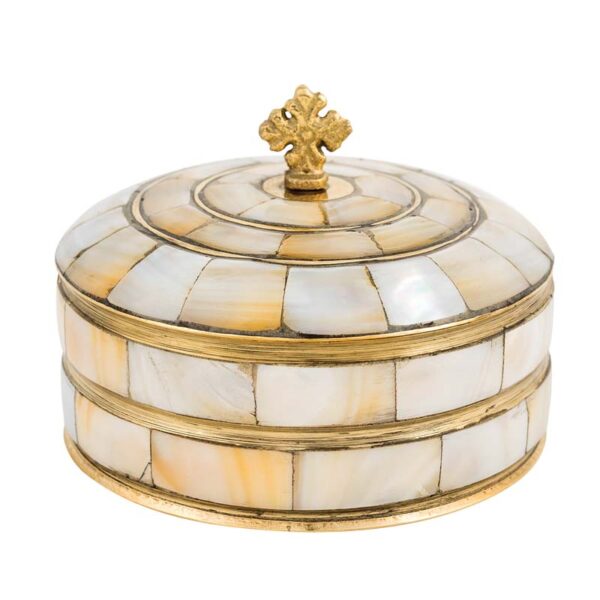Кругла латунна коробка з перламутром і хрестом на кришці.