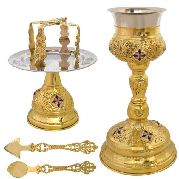 Позолочений латунний євхаристичний набір з 5 предметів зі смальтою.